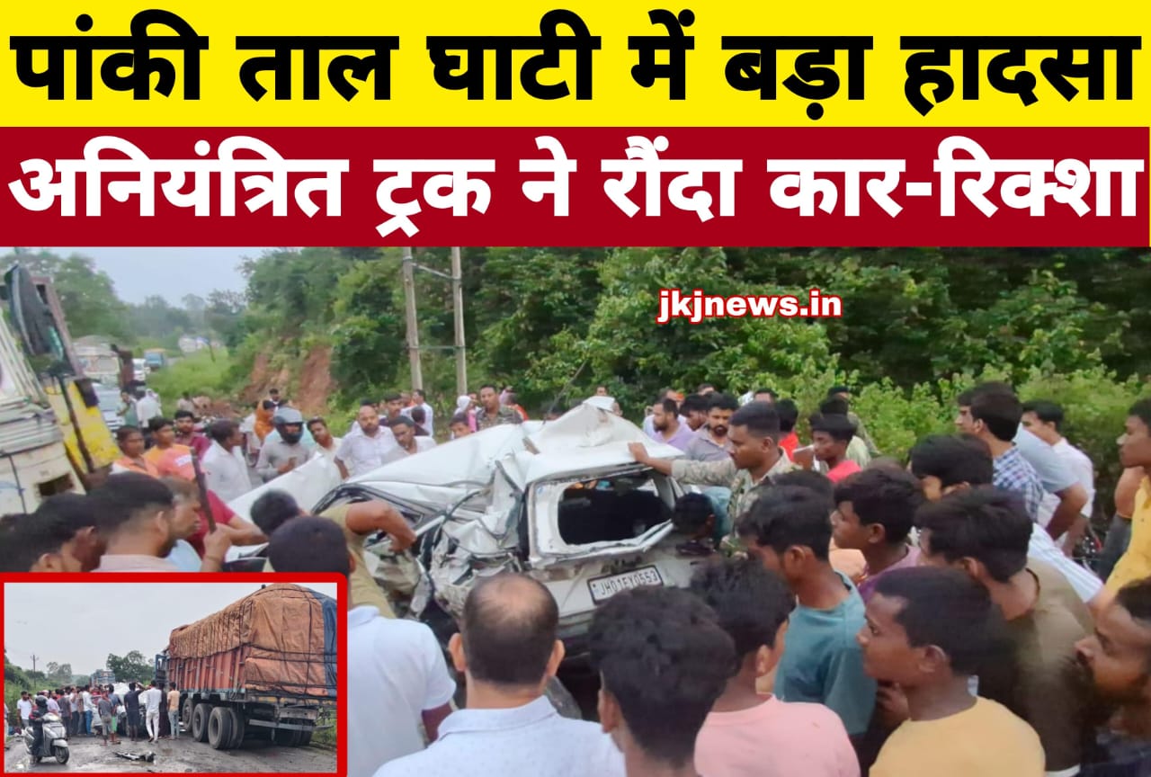 Palamu Accident  News (JKJ News) : पांकी–बालूमाथ मुख्य पथ के ताल घाटी में मंगलवार की शाम लगभग 5:30 बजे एक दिल दहला देने वाली सड़क दुर्घटना घटित हुई। एक अनियंत्रित ट्रक ने कार और ई-रिक्शा को जोरदार टक्कर मार दी। इस हादसे में जहां कार सवार चार लोग बाल-बाल बच गए और उन्हें मामूली चोटें आईं, वहीं ई-रिक्शा पर सवार एक व्यक्ति गंभीर रूप से घायल हो गया। घटना के बाद क्षेत्र में अफरा-तफरी मच गई और मौके पर मौजूद लोग सहम गए।